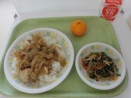 今日の給食は、豚丼、野菜の乾物和え、冷凍みかん、牛乳です。