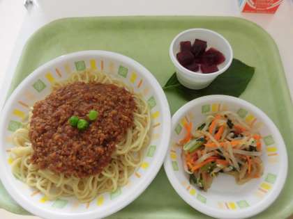 今日の給食は、ジャージャー麺、三色ナムル、あじさいゼリー、牛乳です。あじさいの花をイメージして上はぶどう寒天、下はミルクゼリーで作りました。