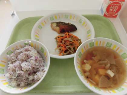 今日の給食は、ゆかりごはん、さばの西京焼き、おひたし、けんちん汁、牛乳です。