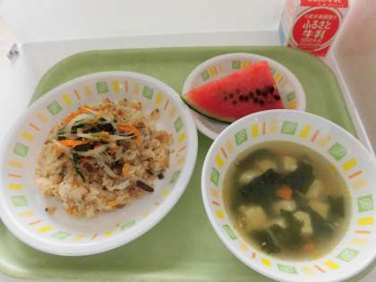 今日の給食は、ビビンバ、わかめスープ、小玉スイカ、牛乳です。