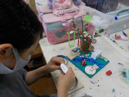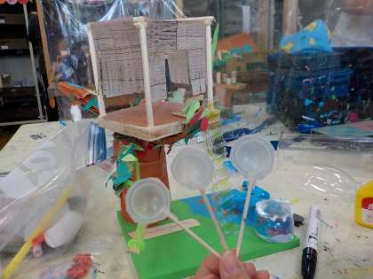たとえば、割りばしやようじで梯子をつくったり、コンタクトレンズのケースの周りを切って釣りの道具をつくったり。