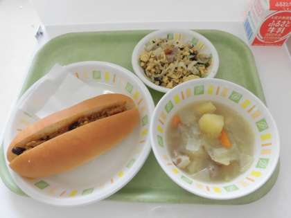 今日の給食は、ドライカレーサンド、ポトフ、卵と野菜のソテー、牛乳です。
