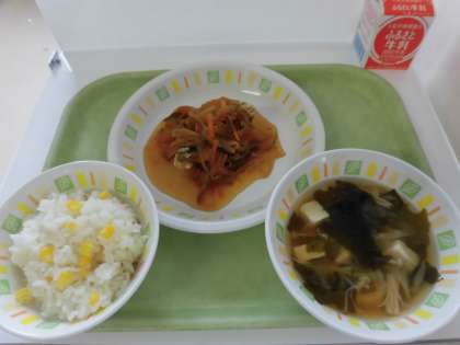 今日の給食は、とうもろこしごはん、揚げさばの甘酢あんかけ、みそ汁、牛乳です。今日のとうもろこしはゴールドラッシュという品種です。