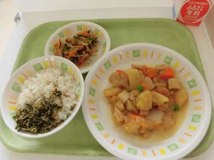 今日の給食は、麦ごはん、青菜とじゃこのふりかけ、鶏肉とじゃが芋の煮物、おひたし、牛乳です。