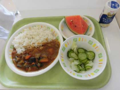 今日の給食は、夏野菜カレーライス、野菜のひとしお、小玉スイカ、牛乳です。