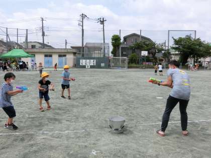 お父様にも参加いただき、水鉄砲の水のかけ合いをしたり、