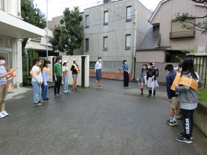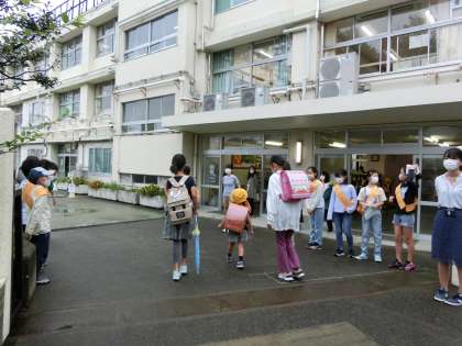 たすきをかけて、代表委員会の子供たちが正門に立って
