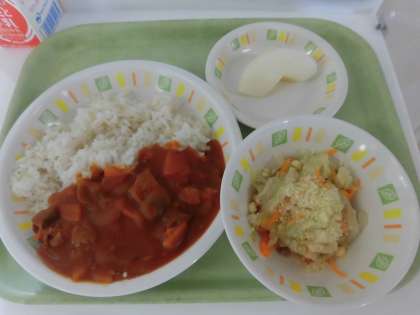 2学期の給食が始まりました。今日の給食は、ハッシュドポークライス、シーザーサラダ、なし、牛乳です。