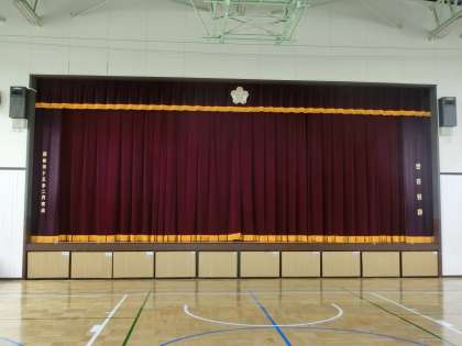 旧北沢小学校、現在の仮校舎の緞帳は、だいぶ古く、