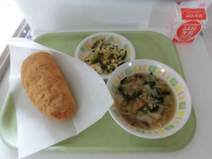 今日の給食は、きな粉あげパン、ワンタンスープ、ゴーヤチャンプル、牛乳です。