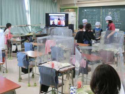 学級によっては、給食中もオンライン。