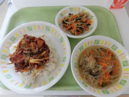 今日の給食は、かきあげ丼、おひたし、そうめん汁、牛乳です。