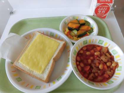 今日の給食は、チーズトースト、ポークビーンズ、パンプキンサラダ、牛乳です。