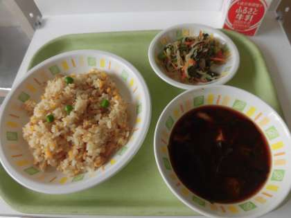 今日の給食は、そぼろごはん、野菜の乾物和え、赤出汁、牛乳です。