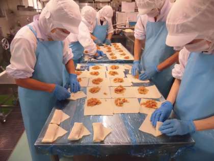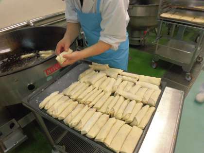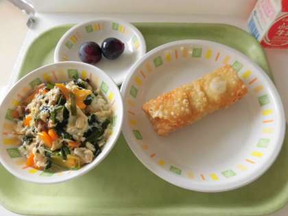 今日の給食は、クッパ、春巻き、ピオーネ、牛乳です。春巻きは360個作りました。