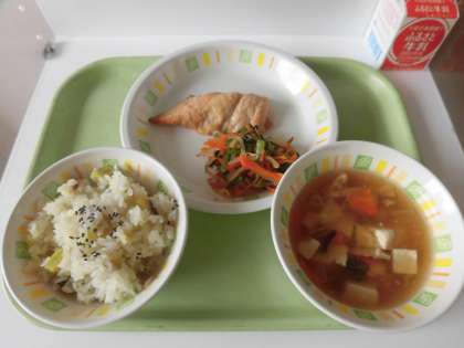 今日の給食は、さつまいもごはん、鮭の西京焼き、きのこ入りおひたし、吉野汁、牛乳です。