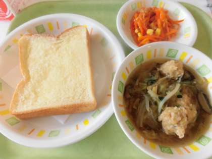 今日の給食は、シュガーバタートースト、肉団子入り春雨スープ、にんじんサラダ、牛乳です。