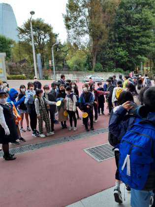 1組は、国会議事堂見学を終え、東京タワーに。2組は、これから国会議事堂へ向かいます。東京タワーのエントランスで二クラスが出会いました。