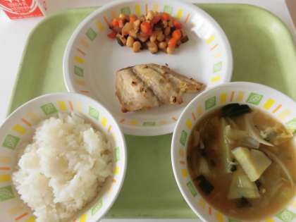 今日の給食は、ごはん、いなだのねぎ塩焼き、五目豆、秋野菜の味噌汁、牛乳です。