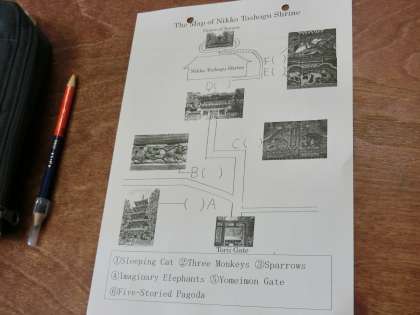日光東照宮の日光三猿や陽明門などの写真や地図を観て、