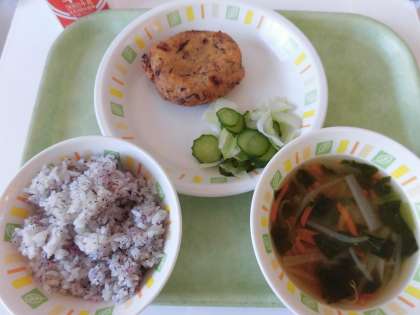 今日の給食は、ゆかりごはん、手作りさつまあげ、野菜のひとしお、みそ汁、牛乳です。