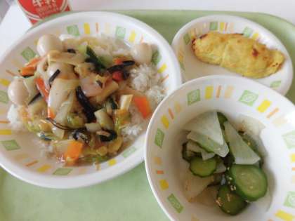今日の給食は、中華丼、きゅうりと大根のごま風味、スイートポテト、牛乳です。