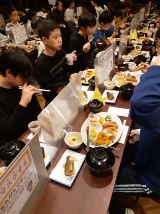 骨付きウィンナー、ロールキャベツやニジマスのから揚げなど、黙食を心がけながらもおしゃべりも楽しみながらいただきました。