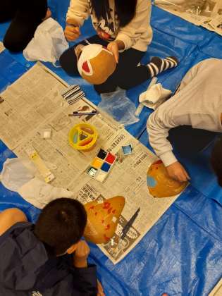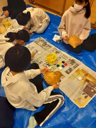 夕食でお腹いっぱいになった子供たち。ふくべ細工で自分らしさを表現しています。