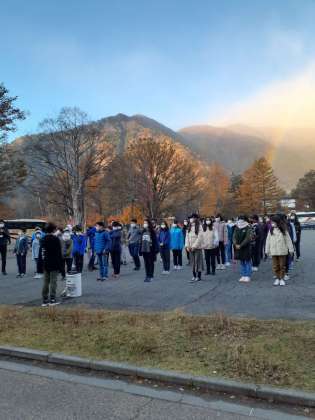 五色山にかかる虹を背景に、ラジオ体操をしています。