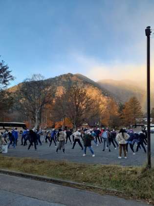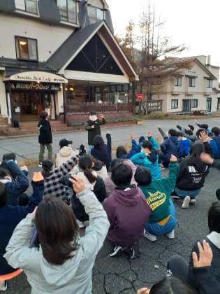 子供たち、6時半の集合時刻前には、宿舎前広場に整列。