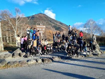 6年生、今日のハイキング、見学を終え、宿舎に戻ります。あまりにも男体山がくっきり見えているので、三本松で学年集合写真を撮りました。これは、卒業アルバムで使わせていただきます。