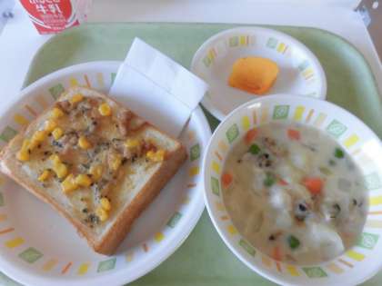 今日の給食は、ツナマヨコーントースト、クラムチャウダー、柿、牛乳です。