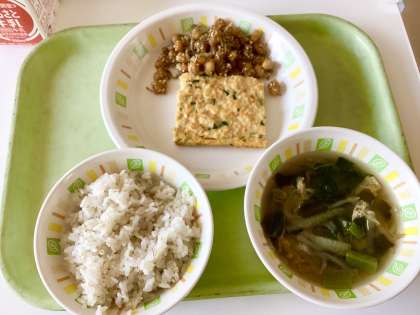 今日の給食は、麦ごはん、千草焼き、大豆とじゃこの甘辛揚げ、大根のみそ汁、牛乳です。