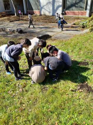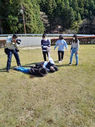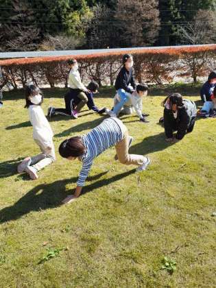 ビレッジの方々が館内の消毒をしてくださっている、「すき間の時間」、子供たちは、ビレッジ前の芝生で、思い思いに過ごしています。