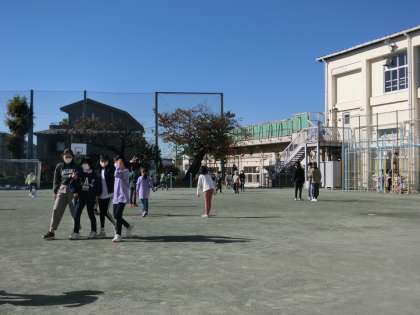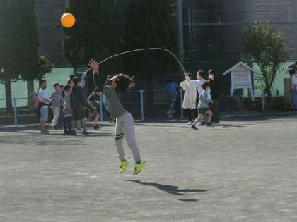 6年生が、2年生や3年生の長なわ跳びの回し手を