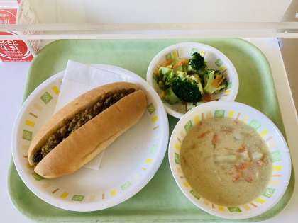 今日の給食は、ドライカレーサンド、豆乳クリームスープ、ブロッコリーのサラダ、牛乳です。