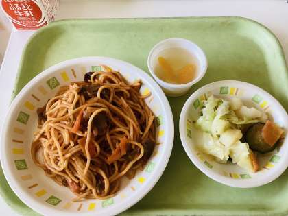 今日の給食は、スパゲティナポリタン、フレンチサラダ、フルーツゼリー、牛乳です。