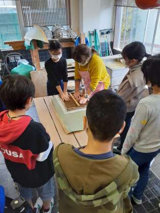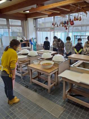 卒業証書の台紙になる用紙を紙漉きで自ら漉く教室に、6年2組後半のグループが山崎小学校を訪れました。