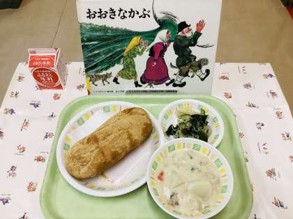 今日の給食は、きな粉あげパン、おおきなかぶのシチュー、じゃこサラダ、牛乳です。