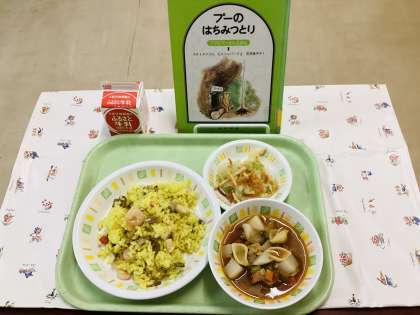 今日の給食は、パエリア、ミネストローネ、プーさんのはちみつサラダ、牛乳です。プーさんが大好きなはちみつをたっぷり使ったサラダにしました。今日で図書館とコラボレーション企画は終了です。また給食を楽しみにしていただけるような献立を考えます。