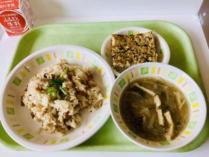 今日の給食は、炊き込みごはん、擬製豆腐、すりごま入りみそ汁、牛乳です。