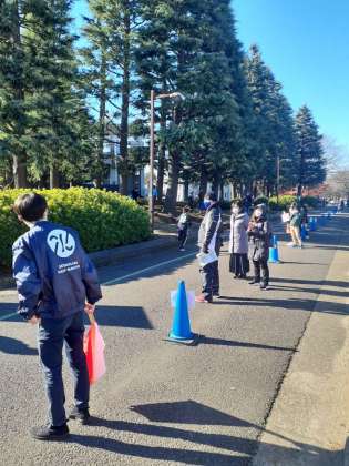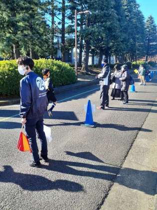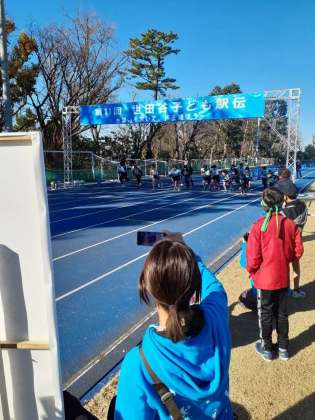 たすきをつないで(感染症対策で背中にタッチ)、富士の学び舎の富士中、代沢小、多聞小、そして、池之上小の子どもたち、快走中です。