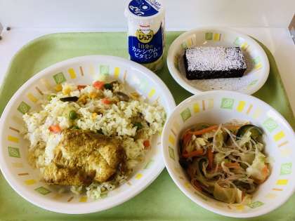 今日の給食は、ジャンバラヤ、春雨サラダ、ブラウニー、ジョアです。今日は、2学期最後の給食でした。今年一年どうもありがとうございました。