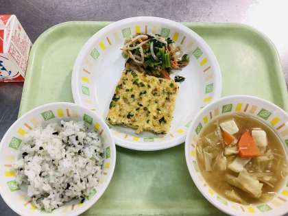 今日の給食は、わかめごはん、切り干し大根入り卵焼き、野菜のごまあえ、豆腐のみそ汁、牛乳です。