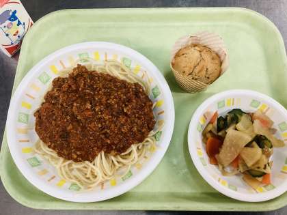 今日の給食は、スパゲティミートソース、シャキシャキ野菜、シナモンアップルマフィン、牛乳です。