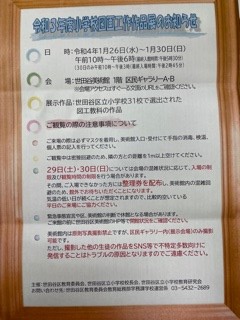 昨年度はコロナの影響で開催できませんでしたが、今年度は感染対策を十分に講じた上で開催することになりました。ただ会場の密を避けるため、以前の作品の点数で出品することができなくなり、池之上小から出品した点数は12点のみになりました。