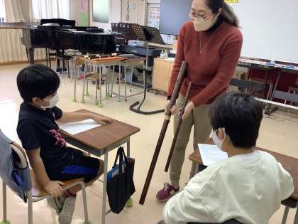 300年前や500年前によく使われていたフルートを間近で見ることができた子供たちは「本当に木でできている!」「僕たちのもっているリコーダーにそっくり!」と驚きの声をあげていました。