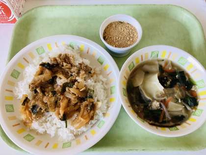 今日の給食は、豚キムチ丼、ワンタンスープ、黒蜜寒天、牛乳です。唐辛子は加熱すると辛さが際立つので、給食では、キムチを入れてからの加熱時間を短くしたり、すりごまを入れて辛さを抑えるように仕上げています。