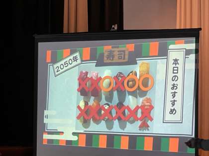 クイズコーナーでは、温暖化が進み続けた2050年、お寿司屋さんではこんなに食べられないネタがある事を知り、「嘘だろ〜!!?信じられない!」と、会場全体で歓声が上がりました。