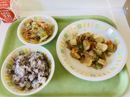 今日の給食は、ゆかりごはん、肉じゃがうま煮、春雨サラダ、牛乳です。給食の肉じゃがには、高野豆腐が入っています。